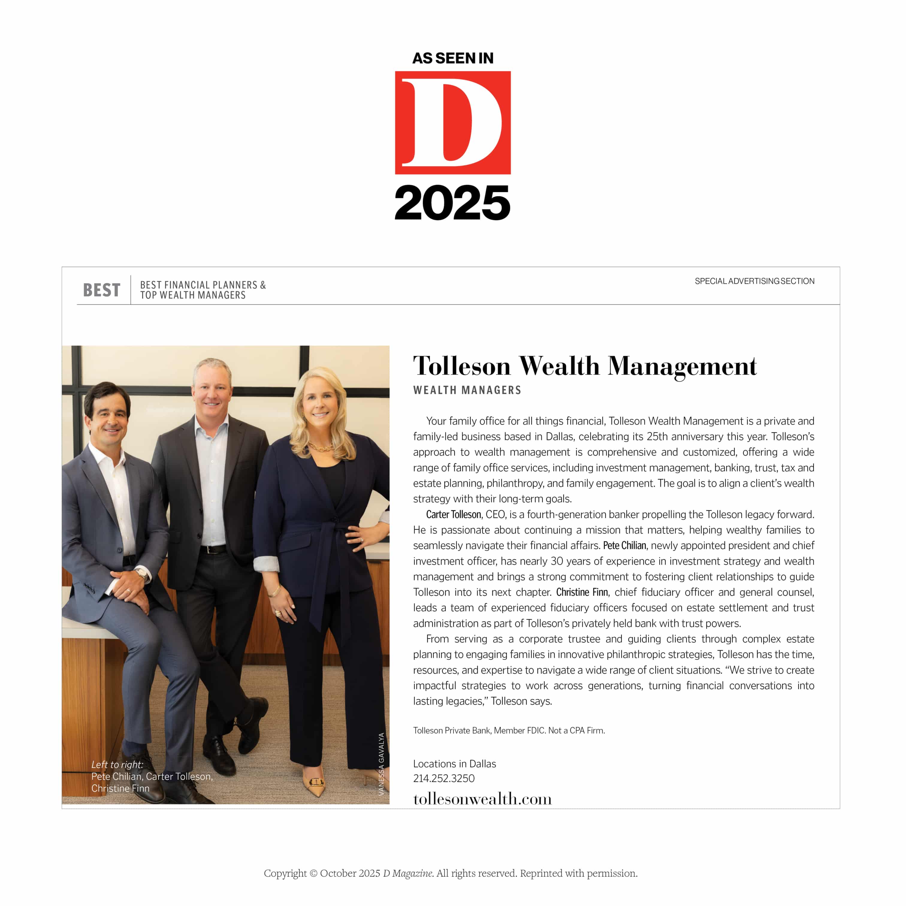 Tolleson Wealth Management was named a Top Wealth Manager by D Magazine for 2025. This marks the 11th consecutive year that the team has received this recognition, reflecting a strong client-focused mission and vision to serve families with all things financial.